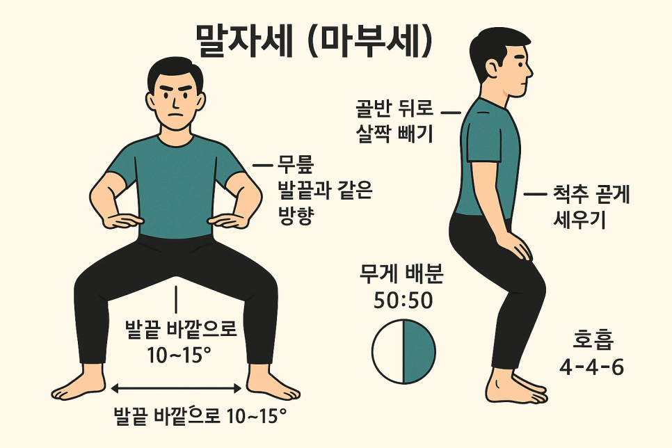 메타 설명: 스트레스 많은 직장인·50~60대 시니어를 위한 말자세(마부세) 하체 단련법. 무게중심을 낮춰 허리·무릎 부담을 줄이고, 균형감·집중력·심신 안정까지 챙기는 실전 루틴.