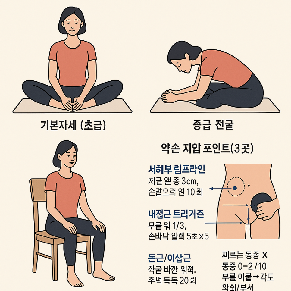 - 무릎을 손으로 억지로 누르기 → 중력·호흡으로만 이완. 억지 압박은 내전근 과긴장·무릎 부담.
