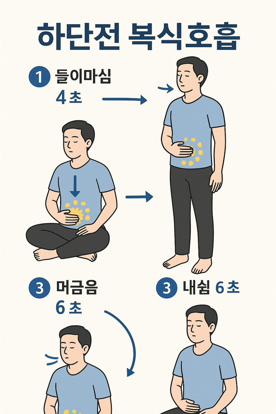- 들이마심 4초: 코로, 하단전이 먼저 부풀도록. 가슴은 최소한.