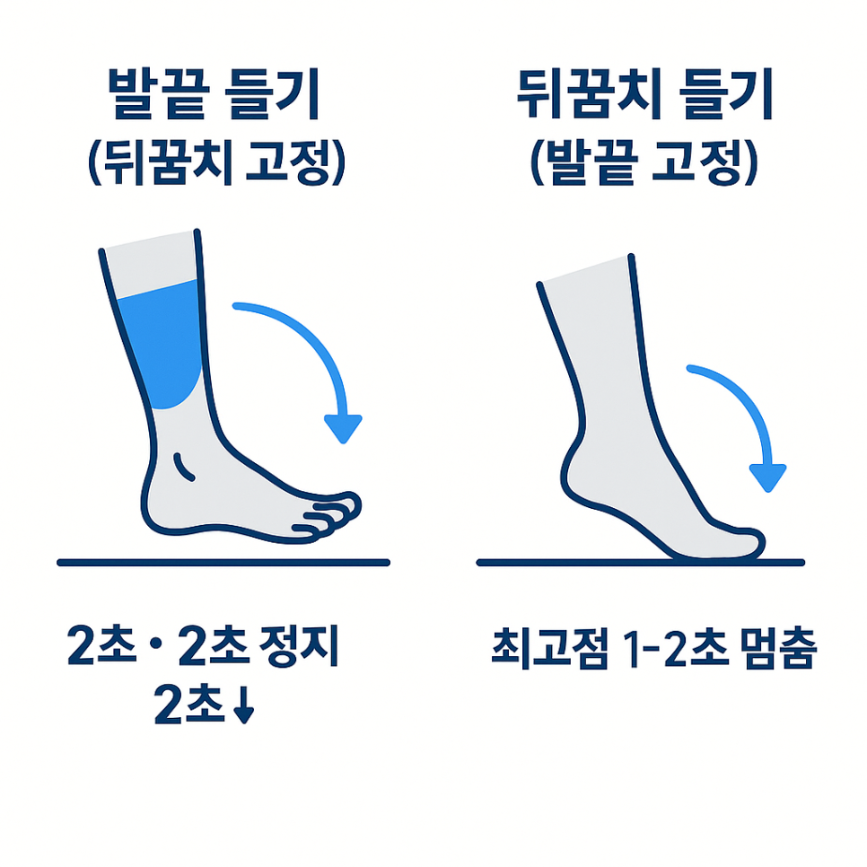 - 밸런스 업: 뒤꿈치 들기 최고점에서 3초 정지 + 두 눈 감고 2초 유지(안전 확보 필수).