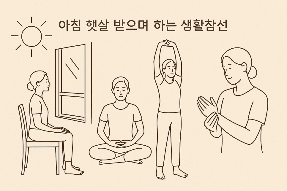 요약: 출근 전 10~15분, 창가나 베란다에서 햇살을 받으며 호흡·기공 스트레칭·약손지압을 결합하면 교감/부교감의 균형이 잡혀 맑은 집중력과 가벼운 몸으로 하루를 시작할 수 있습니다. (직장인·50~60대 시니어 모두 OK)