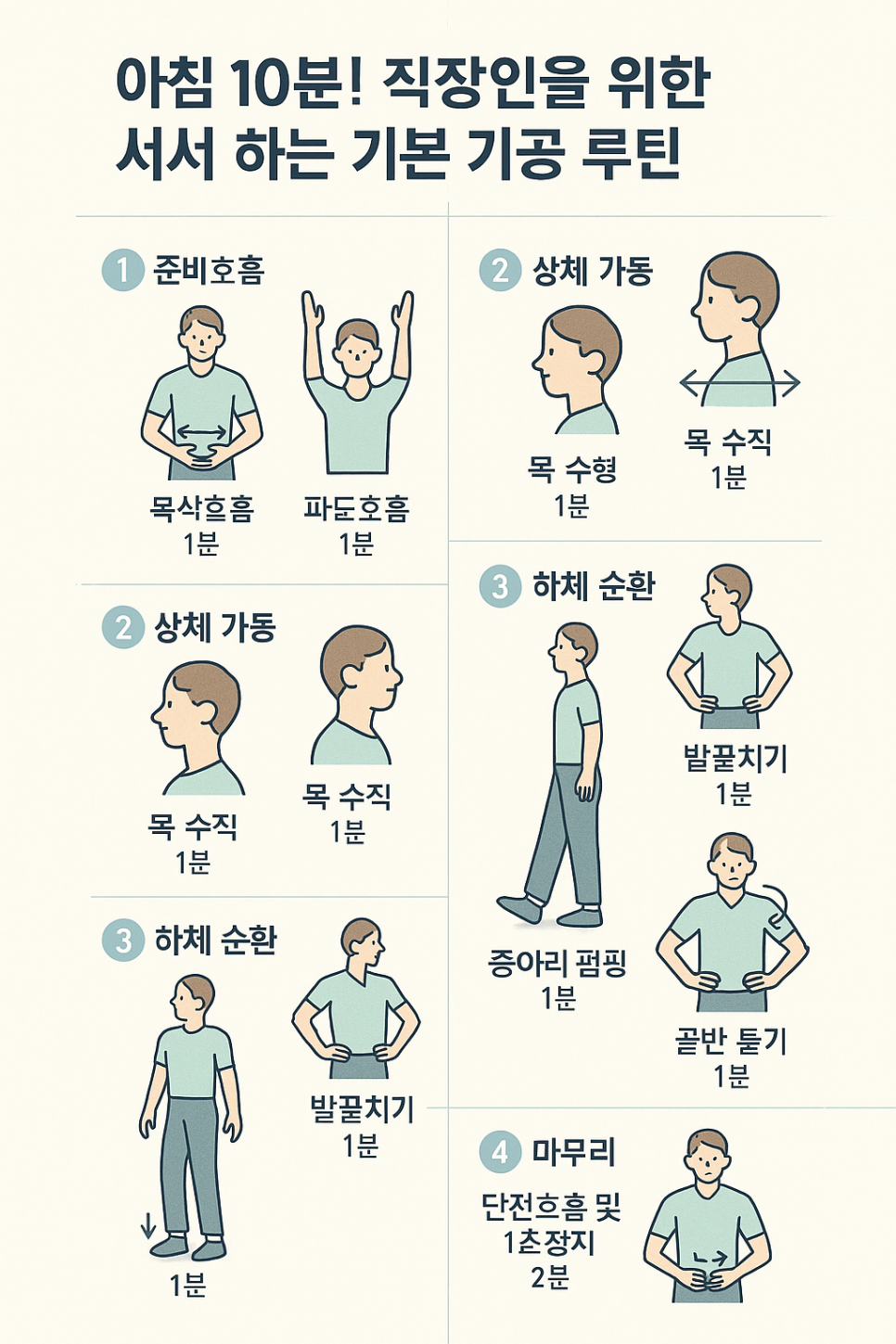출근 전 단 10분. 매트도 도구도 없이 서서만 따라 하면 전신 순환이 살아나고, 목·어깨 뻐근함이 줄며, 오전 집중력이 올라갑니다. 루틴은 ①준비호흡 ②상체 가동 ③하체 순환 ④정리호흡의 네 파트로 구성합니다.