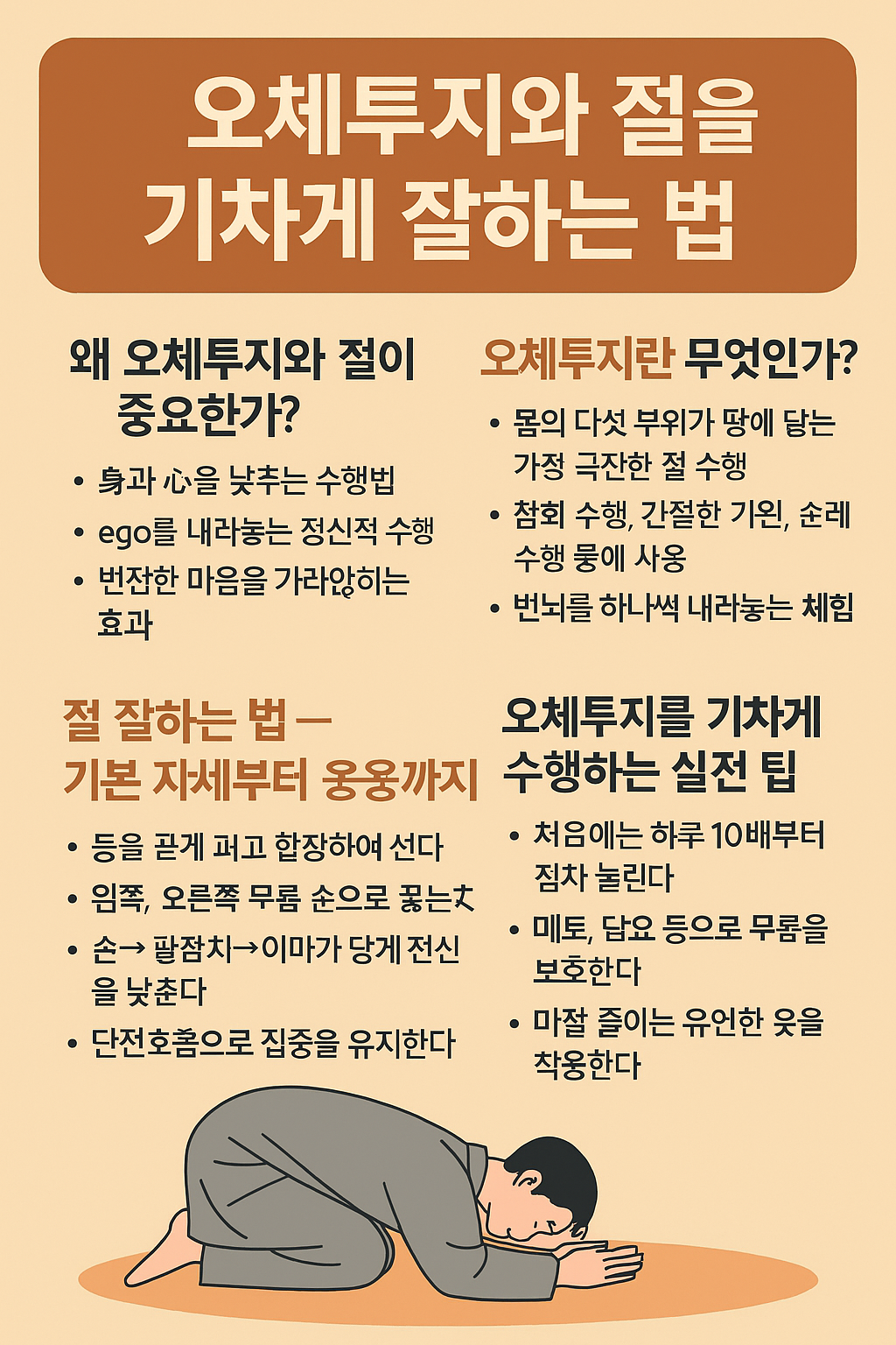절 수행은 정신 집중과 육체 수련이 동시에 이루어지며, 심신의 균형을 회복하고, 번잡한 마음을 가라앉히는 데 탁월한 효과를 줍니다. 이 글에서는 오체투지와 절을 단순히 “많이 하는 법”이 아닌, 올바르게, 깊이 있게, 기차게 잘 수행하는 법을 알려드리겠습니다.
