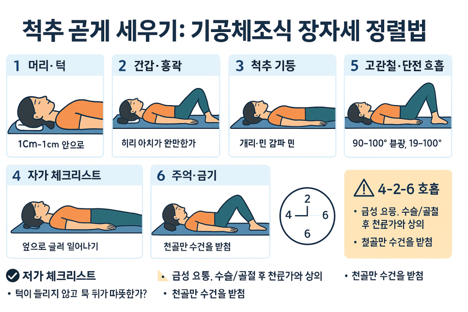 목적: 집에서 10–15분 만에 **누운 자세(長姿勢, 장자세)**로 척추를 부드럽게 정렬하고, 기혈 순환을 돕는 기공체조 루틴. 초보자·사무직·허리 뻐근함을 느끼는 분에게 적합.